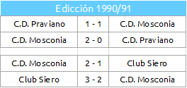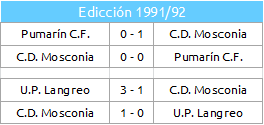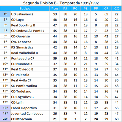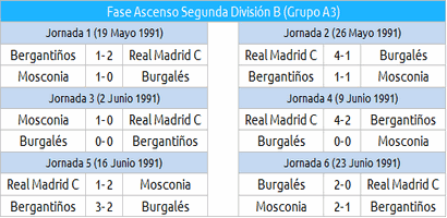 1991 será un ańo para el recuerdo. El Mosconia acaba tercero, lo que le permite jugar la fase de ascenso a Segunda División B. El sorteo lo lleva al Grupo A3, junto al Burgalés (filial del Burgos C.F, en Primera División esa temporada), Bergantińos y Real Madrid C (segundo filial del equipo merengue). El 16 de Junio de 1991 el Mosconia acude a la capital de Espańa para enfrentarse con el primer clasificado, al cual igualaban en puntos. Ese memorable día, nuestro equipo se impuso a los locales por uno a dos, proclamándose matemáticamente campeón de grupo a falta de una jornada, consiguiendo de esta forma el acceso directo a Segunda División B.