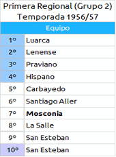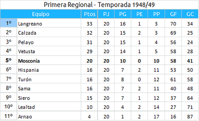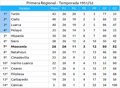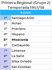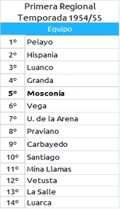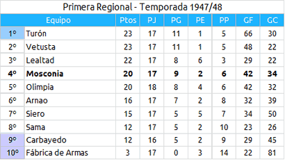 Las primeras noticias halladas sobre el Mosconia en competición oficial se remontan a la temporada 1947/48, campańa en que nuestro club compitió en Primera Regional. Cabe seńalar, que en aquella época la competición nacional consistía en Primera División, Segunda División y 8 grupos de Tercera División (los equipos asturianos estaban integrados en el Grupo 2). A nivel regional estaba la Primera Regional y dos grupos de Segunda Regional. En esa temporada 1947/48, el Mosconia acaba en un meritorio cuarto puesto. Las cuatro temporadas siguientes, nuestro club sigue compitiendo en Primera Regional.