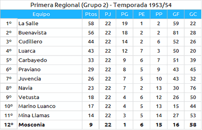 Las fuentes documentales consultadas revelan que en la temporada 1952/53 el Mosconia deja de competir en Primera Regional. Este hecho puede estar relacionado con los vaivenes experimentados por el club en la década de los cincuenta, cuando desaparece y reaparece. En la temporada 1953/54, se vuelven a tener noticias del Mosconia, en este caso compitiendo en Primera Regional - Grupo 2, categoría en la que militará hasta 1958.