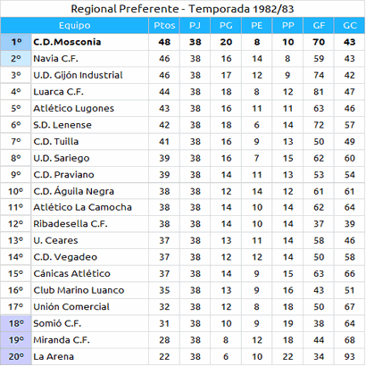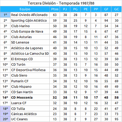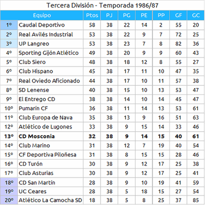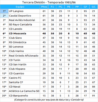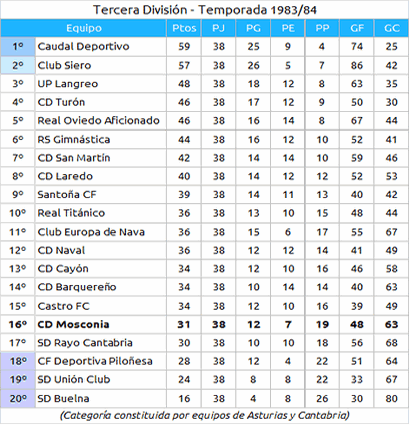 En 1983, el Mosconia acaba como campeón de Regional Preferente, consiguiendo de esta forma el ascenso directo a Tercera División. En 1983/84 debuta en esta categoría militando en el Grupo II, por aquel entonces constituido por equipos de Asturias y Cantabria. Esta organización territorial se mantendría hasta la temporada 1986/87 en la que el Grupo II de La Tercera División pasa a estar integrado únicamente por equipos asturianos. Los ańos siguientes significan la consolidación del Mosconia como un clásico de la Tercera División.