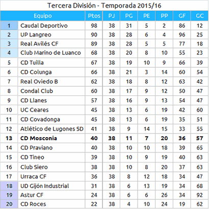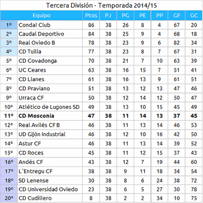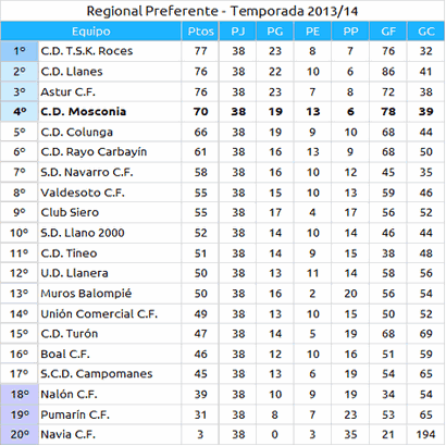 En 2013/14 queda cuarto en Regional Preferente. Esa temporada el U.P. Langreo asciende a Segunda División B, dejando libre una plaza en Tercera que pasa a ocupar el Mosconia. Desde entonces el Mosconia compite en esa categoría.